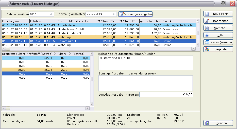 Es ist nicht immer einfach, ein Fahrtenbuch aktuell und auf dem neuesten Stand zu halten. Schnell vergisst man es eine Eintragung zu machen oder berechnet den Monatsabschluss verspätet. Das MAXTAX Fahrtenbuch unterstützt Sie im täglichen Umgang mit Ihrem privaten und geschäftlichen PKW, damit Sie Ihre Kosten und Kilometer jederzeit unter Kontrolle haben. Setzen Sie Fahrten im Zusammenhang mit Vermietung und Kapitaleinnahmen steuerlich ab, berechnen Sie Fahrzeugkosten und Reisezeiten u. v. m. Die Bedienung dieses Programms ist derart einfach, dass Sie direkt nach Erhalt Ihre ersten Eintragungen problemlos vornehmen können. Dabei werden alle gesetzlichen Anforderungen erfüllt, damit Sie mit dem Gesetzgeber jederzeit im Einklang sind.
